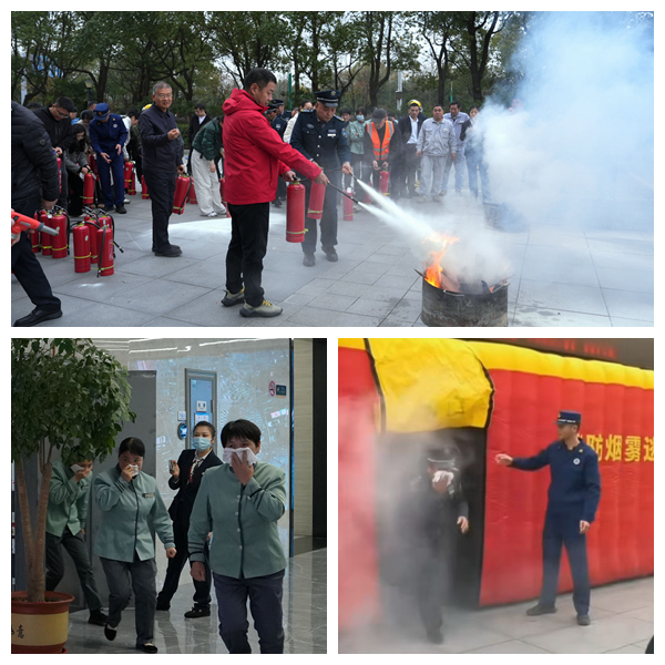 警報響起后,各樓層消防疏散引導員迅速組織人員撤離。員工們用濕毛巾捂住口鼻,沿安全通道有序疏散至一樓廣場。疏散完成后,現場開展了滅火器實操教學與消火栓操作演示,員工分組進行了滅火體驗,并進入“火災煙霧模擬屋”學習應急逃生技能。